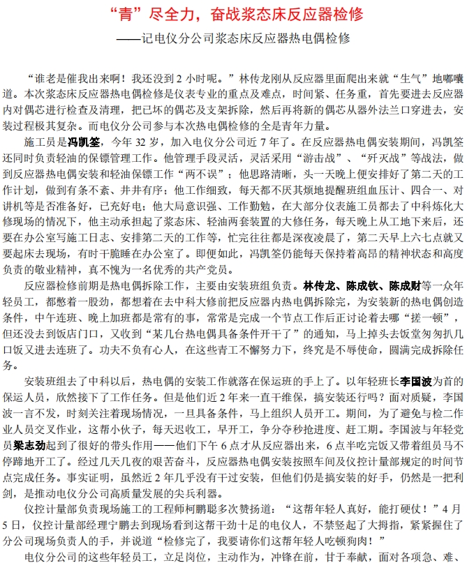 記電儀分公司漿態(tài)床反應器熱電偶檢修