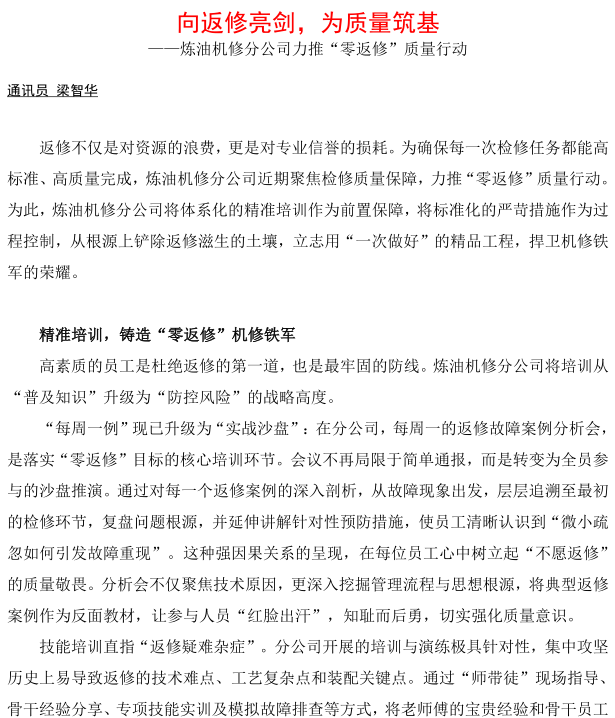 煉油機修分公司力推“零返修”質(zhì)量行動